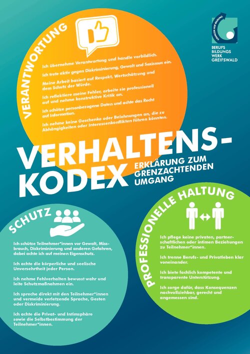Das BerufsBildungsWerk Greifswald bietet jungen Menschen mit Unterstützungsbedarf vielseitige Berufsausbildungs-, Orientierungs- und Unterstützungsmöglichkeiten. Compliance schließt für uns selbstverständlich auch ein, dass wir alle gesetzlichen Vorgaben, ethischen Standards und internen Richtlinien einhalten. Darüber hinaus haben wir einen Verhaltenskodex und ein eigenes Gewaltschutzkonzept entwickelt und stellen auch an die Zusammenarbeit mit Fremdfirmen besondere Anforderungen – für Vertrauen, Transparenz und Integrität gegenüber unseren Teilnehmenden, Mitarbeitenden und Partnern.