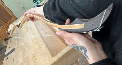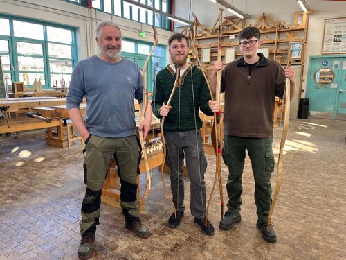 Beim Bogenbauprojekt waren besonders viel Geduld, höchste Präzision, handwerkliches Geschick und unzählige Arbeitsschritte erforderlich, bevor die Teilnehmenden ihre fertigen Bögen in den Händen halten konnten. Zunächst musste geeignetes Holz ausgesucht und selbst zugeschnitten werden. Dabei musste eine Balance zwischen den biegenden und stützenden Eigenschaften des Materials gefunden werden. Dünnschichtige Lamellen wurden in Form verpresst und miteinander verleimt. Danach wurden verzierende Anbauteile präzise angepasst und gestaltet, um die elegante Schönheit eines spannungsgeladenen Bogens zu betonen. Das Schleifen des Bogens war ebenfalls Millimeterarbeit. „Die kleinste Ungenauigkeit kann zum Bruch des Bogens führen“, verdeutlicht Jörg Sinhuber. Deshalb könne man nicht an jedem Tag einen Bogen bauen. „Man muss ganz auf die Arbeit fokussiert sein“, so der Ausbilder.