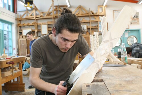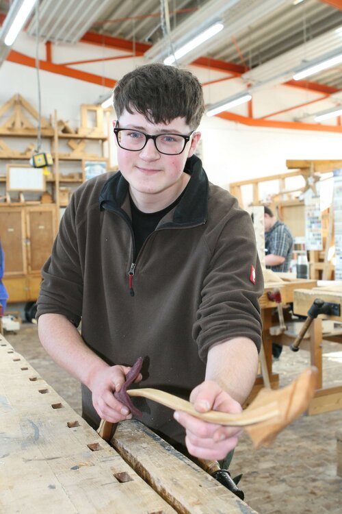 „Ich habe zwei für mich besonders wichtige Dinge gelernt: Was Andere vor mir geschafft haben, das kann ich auch schaffen. Und: Das Endprodukt ist eigentlich schon in dem Stück Holz enthalten. Man muss es bloß „auspacken“. Am Anfang war die handwerkliche Arbeit eine ganz schön fordernde Aufgabe. Die eigenen Gestaltungsideen waren gefragt und dann noch ohne Maschinen zu arbeiten – es erschien mir fast unmöglich. Doch meine Ausbilder gaben mir viel Unterstützung und nutzten viele Vergleiche. Irgendwann habe ich dann gemerkt, dass die Projektarbeiten mein räumliches Denkvermögen, aber auch Ausdauer und Kraft fördern. Und für Dinge, die mit meiner Einschränkung nicht zu schaffen waren, konnte ich gute Lösung finden.“