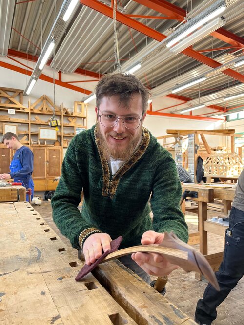 „Ich fand es wahnsinnig cool, dass Herr Sinhuber mit dieser Idee um die Ecke gekommen ist. Er hat für uns die Grundform der Bögen entwickelt und diese zu Hause gefertigt. Die kleinen Bögen sind an die Reiterbögen der Steppenbewohner angelehnt und der große Bogen ist inspiriert vom Englischen Langbogen. Aber es gab keinen fertigen Bauplan für uns. Jeder sollte seinen Bogen selbst designen und eigene Lösungen finden. Während des Projekts konnten wir unsere handwerklichen Fähigkeiten deutlich verbessern. Wir haben auch sehr viel über die Zug- und Spannungsbelastung des Holzes, die Eigenschaften verschiedener Holzarten und die Bedeutungen der Faserrichtungen gelernt. Das Holz hat in manchen Situationen auch mal mächtig dagegengehalten. Doch dank der Unterstützung durch unsere Ausbilder, ihr Lob und ihre gezielte Kritik, ist das Projekt ein voller Erfolg geworden.“