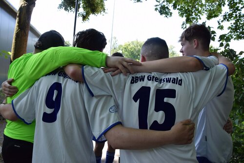 Elf mutige Mannschaften am Start und unser eigenes Team, die tapferen neun Kämpfer*innen aus dem BerufsBildungsWerk Greifswald sind natürlich auch dabei. Jeder gegen jeden – das bedeutet 66 spannende Spiele voller Dramatik, Torraumszenen und natürlich auch ein bisschen Schweiß. Die Sonne brennt, die Stimmung kocht – und die Bälle fliegen nur so durch die Luft!