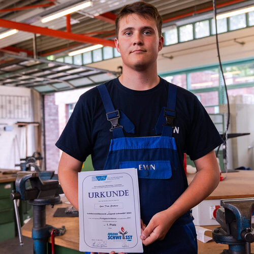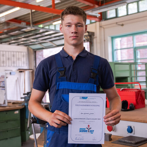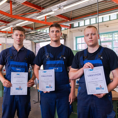 Neben Herrn Rochow, konnten auch die angehenden Industriemechaniker des Entsorgungswerkes für Nuklearanlagen (EWN) Leon Schacht und Konrad Larsen mit ihren guten Platzierungen (3. und 4. Platz) glänzen. Insgesamt haben 16 junge Teilnehmer:innen in 4 verschiedenen Verfahren (Autogen-, Metallaktivgas-, Wolfram Inertgas- & Lichtbogenhandschweißen) an den Landesmeisterschaften teilgenommen. „Die hervorragenden Leistungen von Herrn Rochow sind nicht zuletzt auf die Unterstützung und mentale Vorbereitung durch die Ausbilder im BBW zurückzuführen“, betont Stefanie Wordell, Mitarbeiterin Personalentwicklung der EWN (Entsorgungswerk für Nuklearanlagen GmbH). Die nächste Etappe für Tom Rochow wird die Teilnahme am Bundeswettbewerb sein. Erste Unterlagen, darunter Schweißanweisungen, sind bereits bei den Ausbildern eingetroffen und werden in den kommenden Wochen intensiv mit Herrn Rochow vorbereitet.