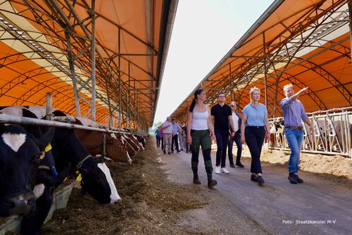 Während des Rundgangs gab Peeneland-Geschäftsführer Philipp Kowolik zunächst einen umfassenden Einblick in die Bereiche Tier- und Pflanzenproduktion und führte die Besucherinnen und Besucher auch durch die Ausbildungsräume des BerufsBildungsWerks. Hier gab es für BBW-Ausbildungsleiterin Britta Pahnke und Teamleiterin Susanne Becker die Gelegenheit, sich mit der Ministerpräsidentin intensiv über die Ausbildung junger Fachkräfte auszutauschen.
