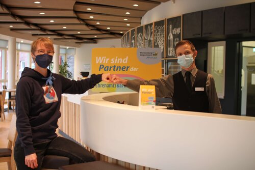Empfangen wurde sie in der Ausbildungscafeteria des Unternehmens, in dem junge Menschen mit unterschiedlichen und komplexen Behinderungen, die Chance bekommen, eine Ausbildung im Fachbereich Ernährung/Wirtschaft/Verwaltung zu machen. Teamleiter Patrick Schicka nahm stellvertretend für das gesamte Team das Partnerpaket mit verschiedenen Werbematerialien entgegen, die auf die Vorteile für Besitzer*innen der Ehrenamtskarte aufmerksam machen sollen. Sie erhalten nämlich ab diesem Jahr 20 % Rabatt auf alle Angebote in der Ausbildungscafeteria in der Pappelallee 2. Und ein Besuch lohnt sich allemal, die gerade erst eröffnete Ausbildungscafeteria erstrahlt nun in einem modernen Glanz. Es erwartet Sie ein tägliches Mittagsangebot aus vegetarischen und nicht vegetarischen Speisen aber auch frisch gebackener Kuchen und Kaffeespezialitäten.