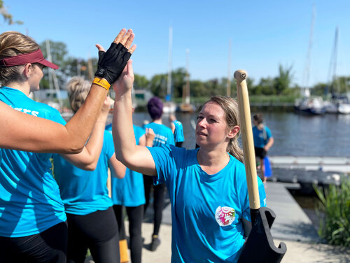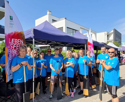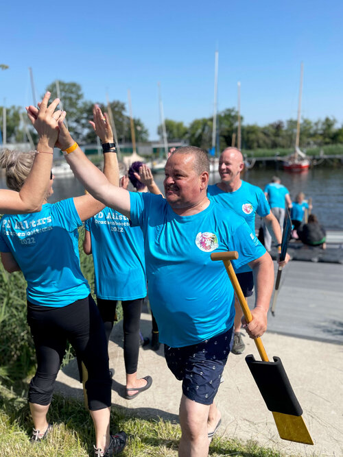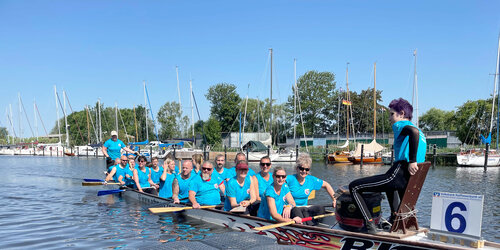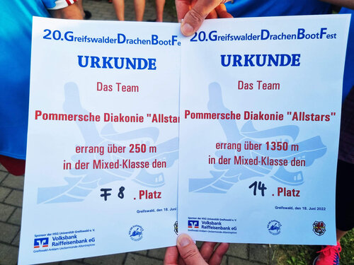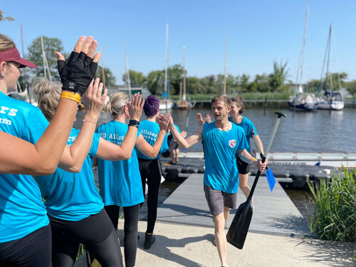 Als Teil der Unternehmensgruppe Pommersche Diakonie haben sich die Kolleg*innen aus den verschiedenen Geschäftsbereichen zusammengefunden, um nach zweijähriger Pause wieder beim größten Sportereignis in Greifswald teilzunehmen. Neben dem BBW waren auch Mitarbeiter*innen der Norddeutschen Gesellschaft für Bildung und Soziales (NBS), der Geschäftsbereiche assistieren und arbeiten, sowie der Züssower und Catering GMBH im Team „Pommersche Diakonie Allstars“. Alle gemeinsam sind sie nicht nur herausragend im Umgang mit Menschen, sondern auch wenn es um die geschäftsübergreifende Zusammenarbeit geht. „Unser Ziel war es ein Boot mit den Kollegen der Unternehmensgruppe zusammen zu stellen und gemeinsam über die Ziellinie zu paddeln. Dafür haben wir in den letzten Wochen regelmäßig trainiert, um an Technik und Synchronität zu feilen. Wir wollten nicht erster werden, sondern einen tollen Tag mit viel Teamspirit erleben,“ unterstreicht Anja Schneider, Koordinatorin des Teams und Fachreferentin im BBW Greifswald. Das Prinzip ist ganz einfach, in jedem Boot sitzen 18 Paddler*innen, hinten stehen der Steuermann oder die Steuerfrau und dann wird gepaddelt, natürlich im vorgegebenen Rhythmus des Trommlers. Aufgrund der unterschiedlichen Arbeitszeiten saßen die Mitglieder erstmalig beim Drachenbootfest in der vorgegebenen Konstellation zusammen und diese Leistung kann sich sehen lassen. Das Team errang über 250m in der Mixed/Fun-Klasse der 8. Platz von 12 und bei über 1350 m in der Mixed-Klasse den 14. Platz von 18. Die derzeitige Crew will auch 2023 an den Start gehen. Dann heißt es wieder: „Are you ready? Attention! Go!“.