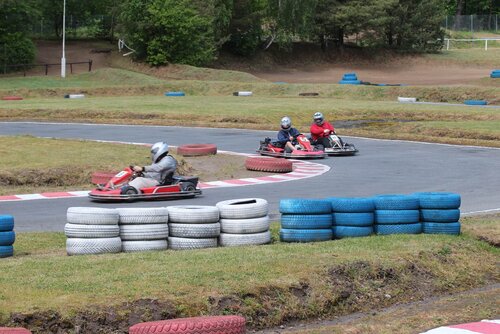 Gut ausgerüstet mit Kart und Schutzhelm, sorgte die noch feuchte Strecke bei den Jugendlichen für den einen oder anderen spaßigen Dreher. Je trockener die Bahn dann wurde, desto spannender wurden die Rennen, denn endlich konnte auch rasant überholt werden. Übrigens: Kart fahren ist eine ziemliche anstrengende Sache.